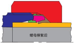 与传统的金属渐进式卡套不同,KDL 卡套在结构上提供了一个耐油橡胶密封圈,如图所示。硫化在金属定位环位于接头体 24°内锥和钢管的外壁之间,密封住了接头唯一的泄漏通道, 不仅可封闭管内的压力流体,同时可以防止在管内失压的情况下空气进入管路系统。这样的密封接头,密封效果与流体压力值成正比,因此即使在高压工况下也能同样能具有极为理想的密封效果(额定工作压力下,压力与大,密封越好)。同时由于橡胶橡胶圈工作处于静压状态,使得其使用寿命也特别长。